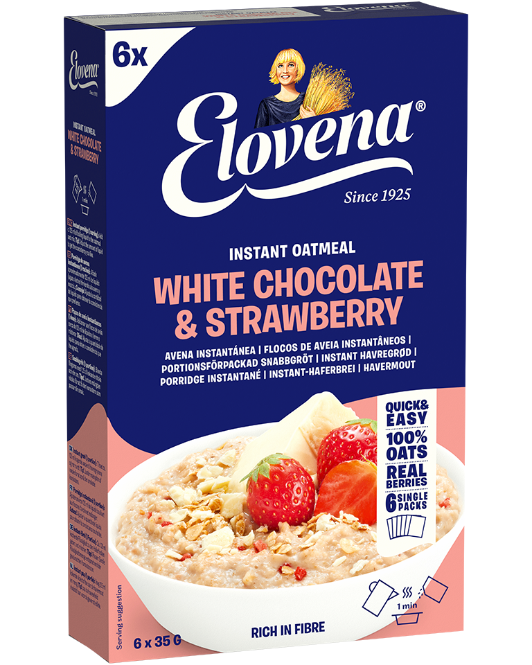 Elovena Instant Oatmeal combina los deliciosos sabores de chocolate blanco y fresa con las mejores cualidades de la avena. Este producto rico en fibra satisface los antojos dulces de manera saludable. Tu porridge favorito es fácil de preparar directamente desde el sobre individual: solo añade leche o agua hirviendo y disfruta.